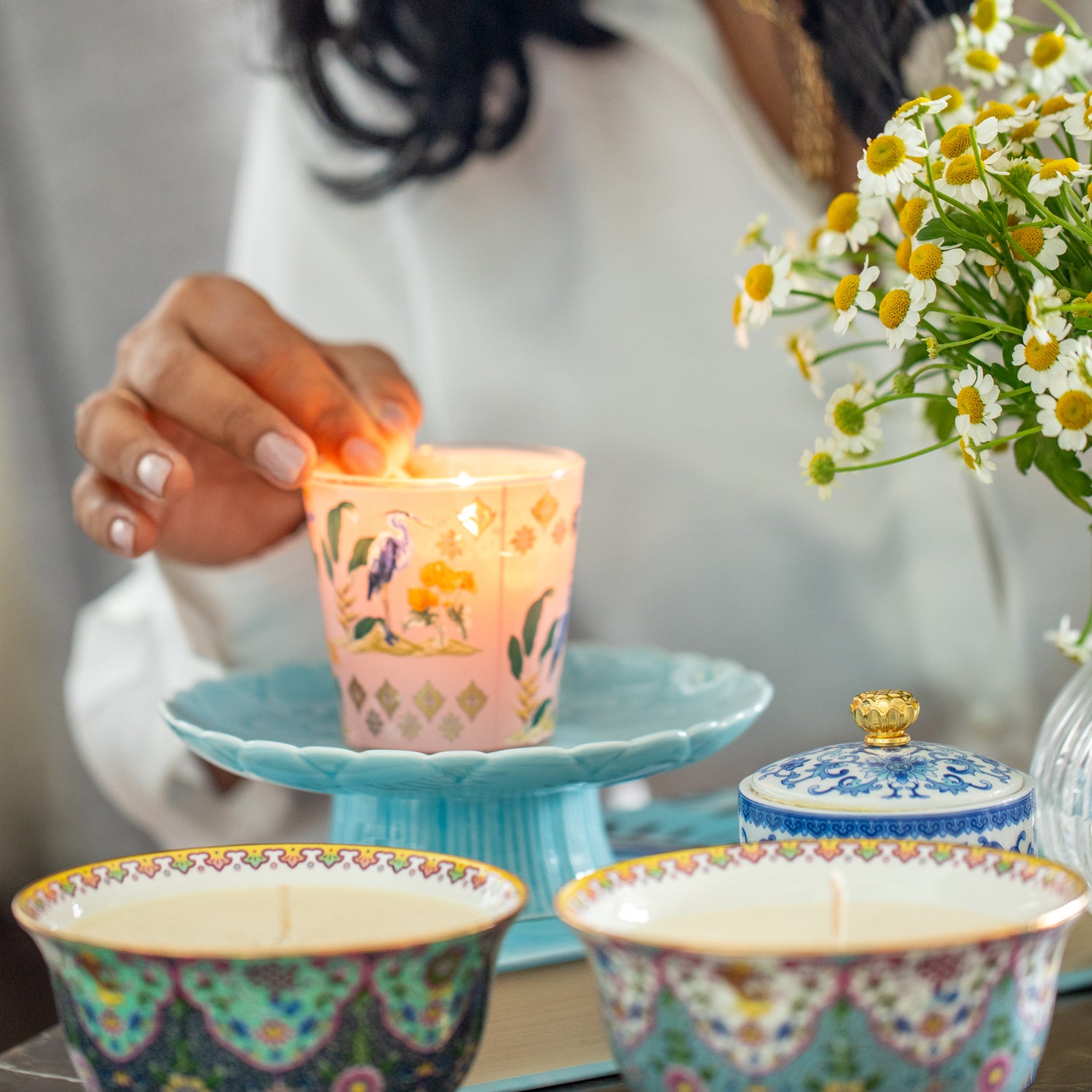 Handpoured in Hongkong, these candles are poured in kulhads handmade out of clay, fired at high temperature by the studio-potters in India. All are hand painted with unique Indian botanical patterns and designs.